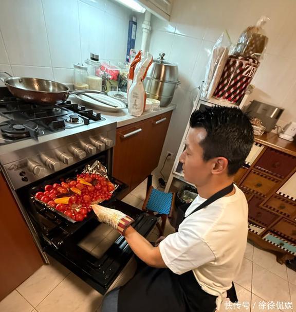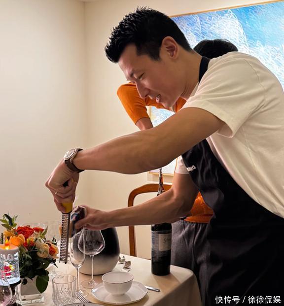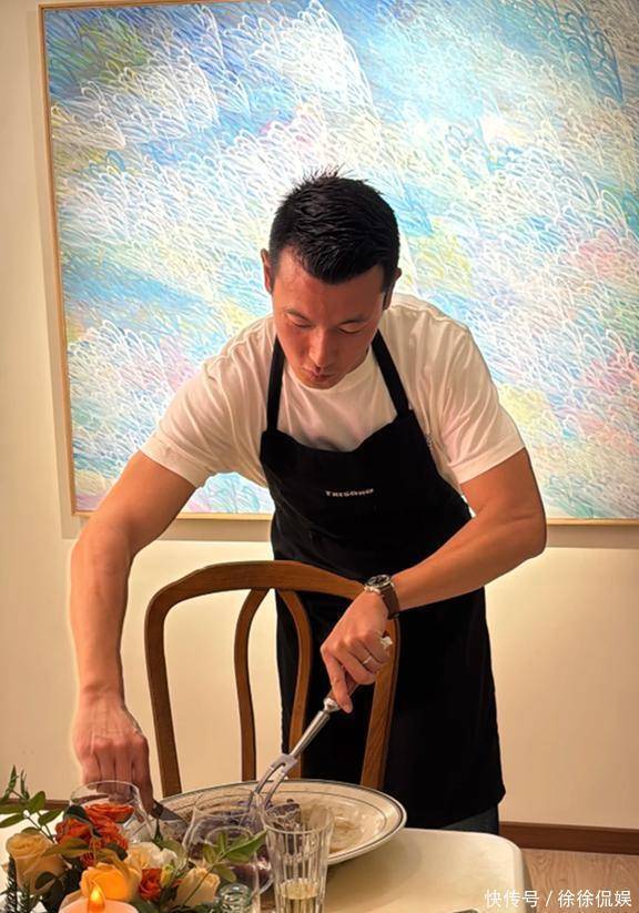 照片里有王昀佳的特写,是朱珠给拍的。他穿着件白T恤,外面套了个黑围裙,正低着头专心致志地切牛肉呢。这手臂上的肌肉线条,一看就是天天泡健身房的主儿,结实得很。手上那枚无名指的婚戒也特别显眼,一股子“我是有老婆的人”的稳重劲儿,不得不说,朱珠找老公的眼光确实挺毒。